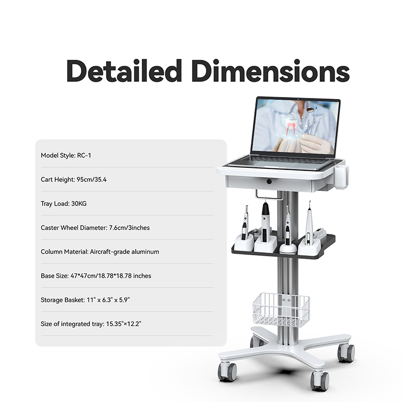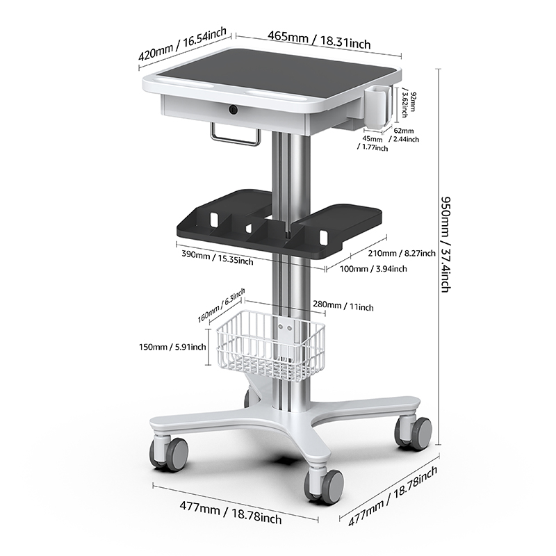 Trạm làm việc di động hạng nặng này có khung nhôm anodized cho độ bền nhẹ và khả năng chống gỉ sét. Đế được gia cố giúp duy trì sự ổn định khi di chuyển, lý tưởng cho môi trường lâm sàng và chuyên nghiệp.