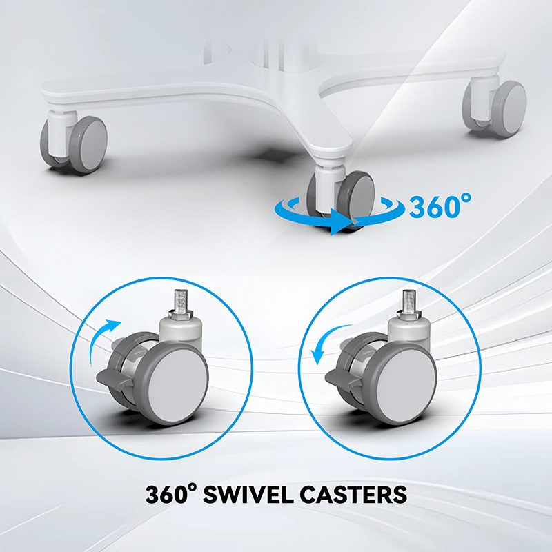 Xe đẩy máy tính xách tay Likaymo được trang bị bốn bánh xe xoay 360° đường kính lớn 7.6 cm (3 inch) với hệ thống phanh chân, mang lại khả năng di chuyển dễ dàng và kiểm soát cố định đáng tin cậy. Bánh xe cỡ lớn lướt nhẹ nhàng qua ngưỡng cửa và các đoạn chuyển tiếp trên thảm, đảm bảo di chuyển dễ dàng trên sàn hỗn hợp tại phòng khám, bệnh viện hoặc thẩm mỹ viện. Được hỗ trợ bởi khung thép chắc chắn, xe đẩy duy trì sự ổn định hoàn toàn trong suốt quá trình thực hiện thủ thuật, đồng thời các bánh xe khóa giữ cố định xe chắc chắn khi cần thiết.