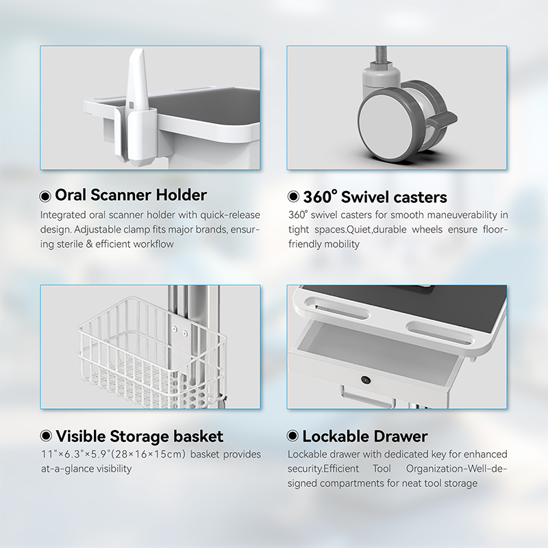 Xe đẩy nha khoa được trang bị giá đỡ máy quét đa năng, được thiết kế chính xác, tương thích với các thương hiệu lớn như iTero, Sirona và Planmeca. Linh kiện này giúp sắp xếp máy quét gọn gàng trong suốt quá trình phẫu thuật, giảm thiểu tình trạng tắc nghẽn không gian làm việc. Thiết kế ổn định giúp giảm thiểu sự dịch chuyển không mong muốn của thiết bị nhạy cảm.