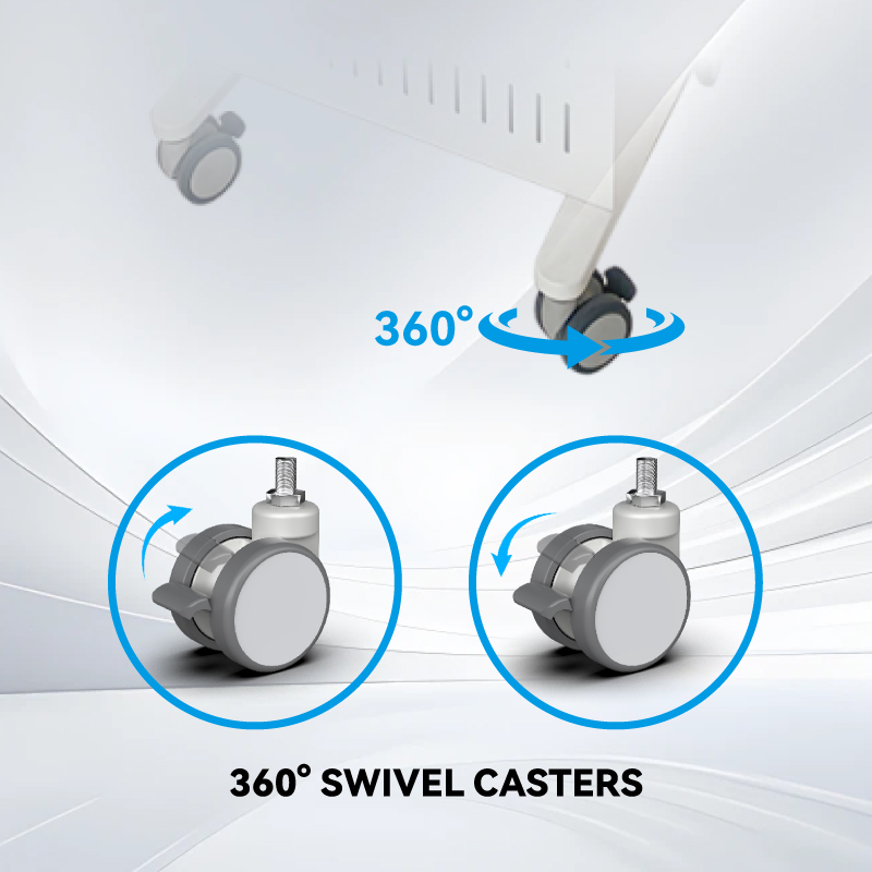 Xe đẩy máy tính xách tay Likaymo được trang bị bốn bánh xe xoay 360° đường kính 7.6 cm (3 inch), cùng với phanh chân giúp di chuyển êm ái và định vị chắc chắn. Bánh xe lớn dễ dàng vượt qua ngưỡng cửa và các điểm chuyển tiếp trên thảm, mang lại khả năng di chuyển dễ dàng trên nhiều loại sàn khác nhau tại phòng khám, bệnh viện hoặc thẩm mỹ viện. Kết hợp với khung chắc chắn, xe đẩy luôn ổn định trong quá trình sử dụng, và các bánh xe khóa đảm bảo xe luôn cố định khi dừng.