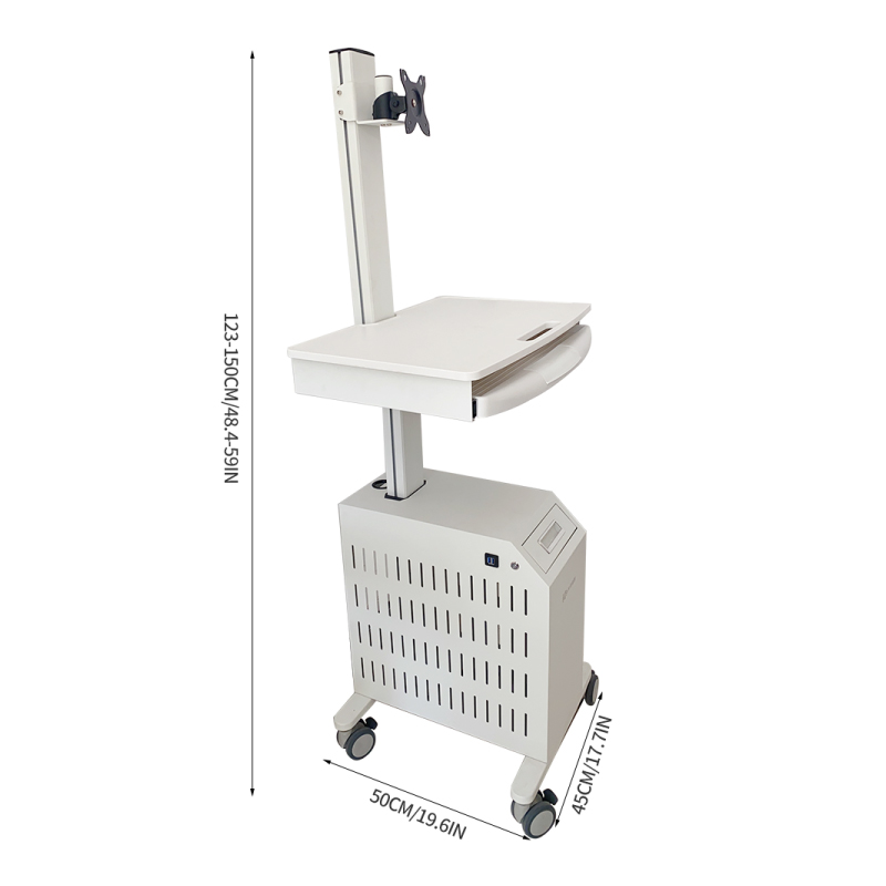 Xe đẩy y tế này có cột điều chỉnh độ cao, hỗ trợ màn hình kỹ thuật số để theo dõi dữ liệu bệnh nhân theo thời gian thực. Thiết kế tinh gọn bao gồm khay bàn phím trượt và đế di động chắc chắn với bánh xe có khóa giúp di chuyển trong phòng khám.