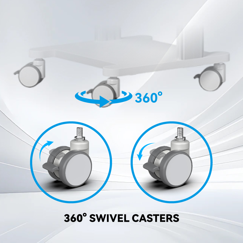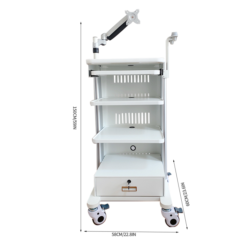 Xe đẩy y tế này có cột điều chỉnh độ cao, hỗ trợ màn hình kỹ thuật số để theo dõi dữ liệu bệnh nhân theo thời gian thực. Thiết kế tinh gọn bao gồm khay bàn phím trượt và đế di động chắc chắn với bánh xe có khóa giúp di chuyển trong phòng khám.