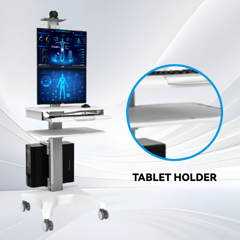 Xe đẩy làm tròn thông minh có màn hình kép để xem xét dữ liệu hiệu quả, bàn phím kéo ra để dễ dàng nhập liệu và khay đa năng để đựng dụng cụ y tế, hợp lý hóa quy trình làm việc lâm sàng tại điểm chăm sóc.