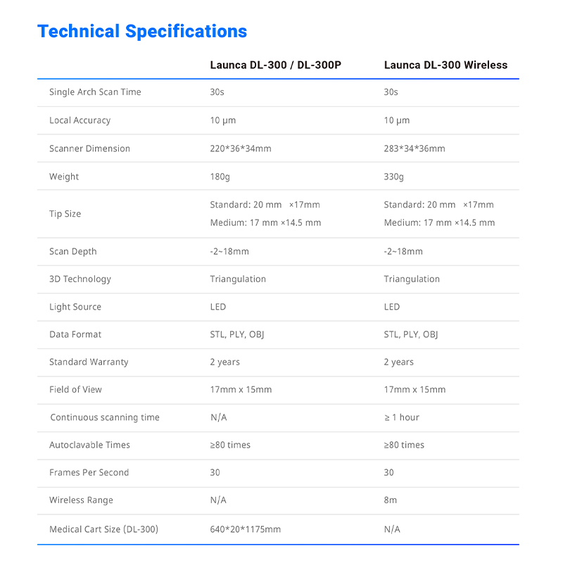Launca DL-300P là một máy quét trong miệng siêu nhẹ, di động thế hệ mới Được thiết kế dành cho các phòng khám nha khoa trên toàn cầu. Được hỗ trợ bởi hơn 10 năm kinh nghiệm nghiên cứu và phát triển công nghệ hình ảnh 3D độc quyền và kinh nghiệm nha khoa kỹ thuật số của Launca, sản phẩm này định nghĩa lại việc quét kỹ thuật số với kích thước nhỏ gọn hơn, trường nhìn rộng hơn, tốc độ nhanh hơn và nhiều chức năng phong phú hơn. Sản phẩm cân bằng giữa sự thoải mái cho người vận hành và trải nghiệm của bệnh nhân, với thiết kế nhẹ, tiện dụng, đầu quét hai kích cỡ, đầu dò có thể tiệt trùng bằng nồi hấp với độ bền cao, mô hình 3D độ chính xác cao và khả năng cộng tác đám mây tất cả trong một. Sản phẩm đáp ứng đầy đủ nhu cầu lâm sàng về phục hình, chỉnh nha, cấy ghép nha khoa và nhiều hơn nữa, giúp các phòng khám và phòng thí nghiệm đơn giản hóa quy trình làm việc, cải thiện hiệu quả và tăng cường giao tiếp, trở thành thiết bị chuyên nghiệp lý tưởng cho điều trị nha khoa kỹ thuật số.