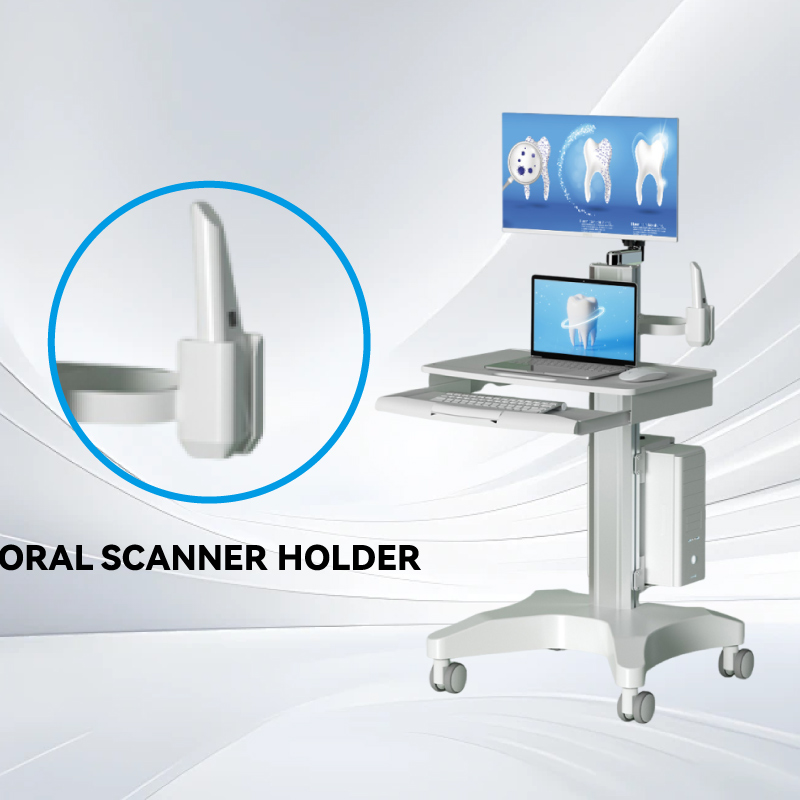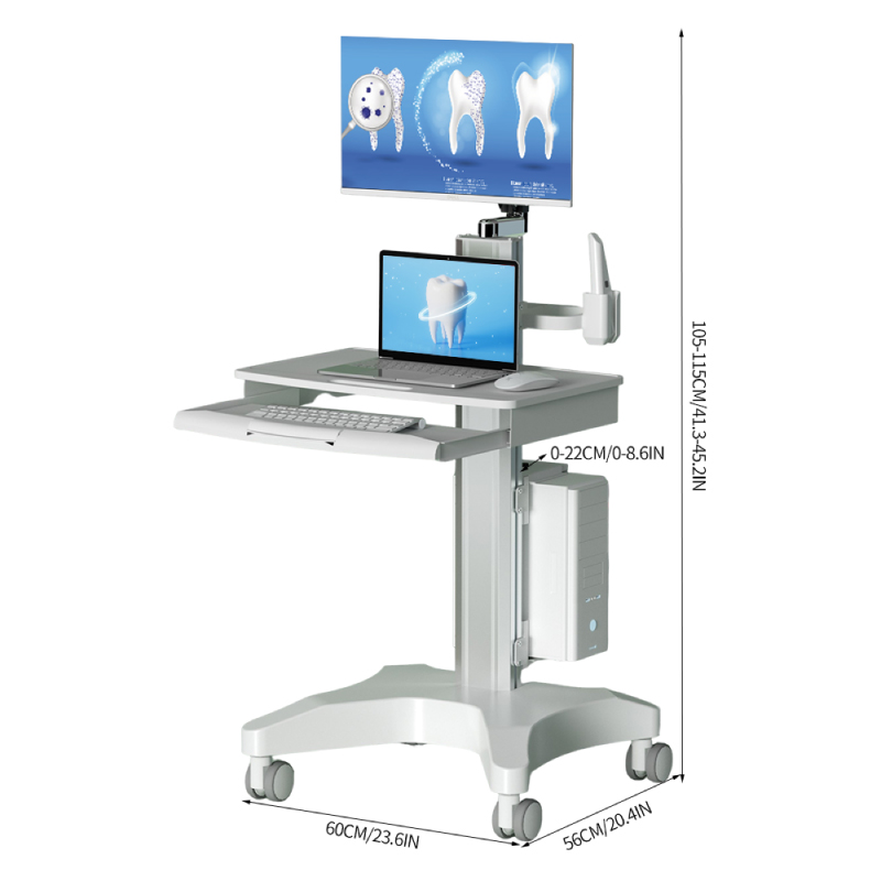 Trạm làm việc nha khoa đa năng, kiểu dáng đẹp mắt với màn hình có thể điều chỉnh, giá đỡ CPU tích hợp, khay bàn phím kéo ra và giá đỡ máy quét miệng an toàn. Được thiết kế để mang lại hiệu quả và tính di động cao trong lâm sàng.