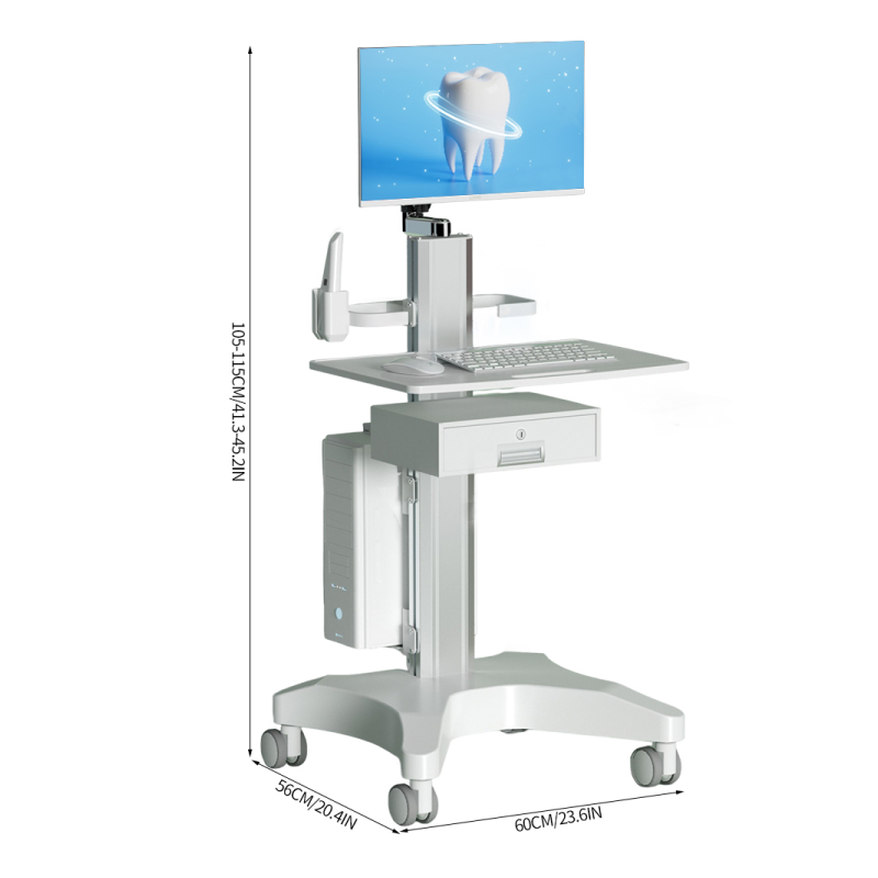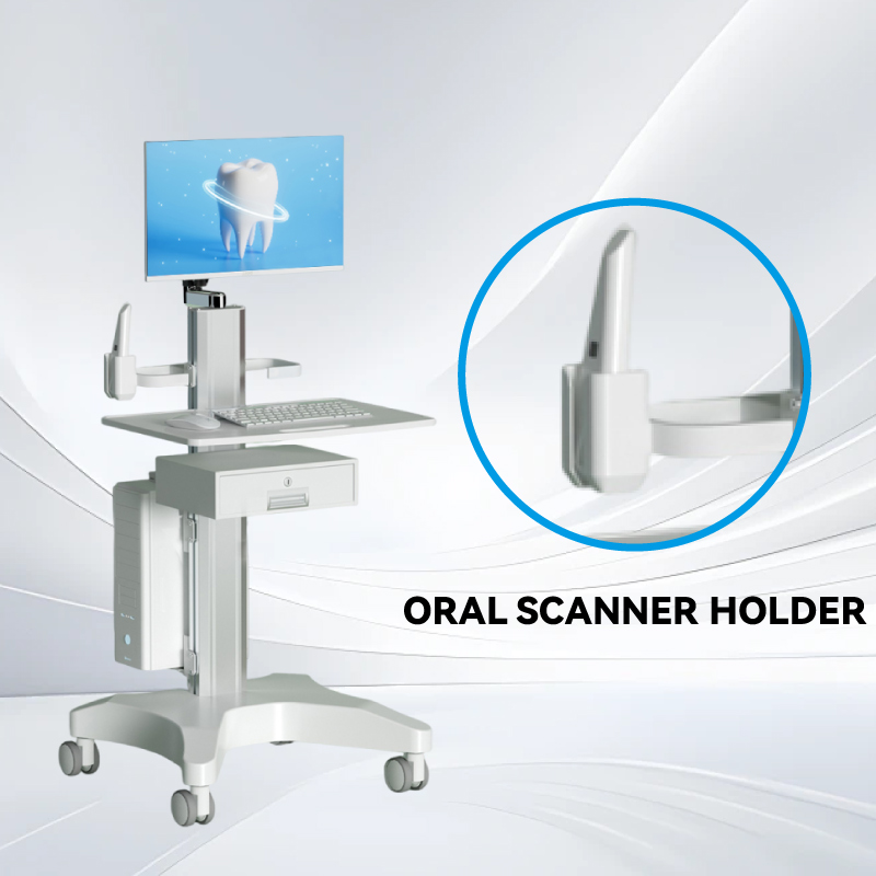 Xe đẩy nha khoa đa năng này tích hợp máy trạm PC, màn hình điều chỉnh được để quét 3D và giá đỡ máy quét miệng an toàn. Xe đẩy có khay bàn phím kéo ra và ngăn kéo có khóa giúp sắp xếp đồ đạc gọn gàng, đảm bảo quy trình làm việc lâm sàng hiệu quả và di động.