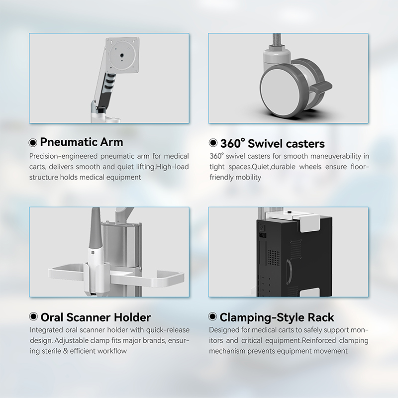 Xe đẩy y tế di động này có giá đỡ chuyên dụng, an toàn cho máy quét miệng. Nó giúp đơn giản hóa quy trình làm việc kỹ thuật số bằng cách sắp xếp các thiết bị hình ảnh cần thiết một cách ngăn nắp và di động, nâng cao hiệu quả lâm sàng và chăm sóc bệnh nhân. Thiết kế tiện dụng đảm bảo tích hợp liền mạch vào bất kỳ phòng khám nha khoa nào.