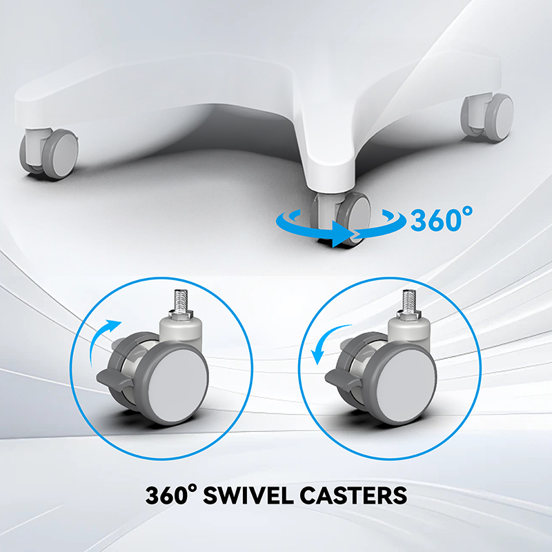 Xe đẩy máy tính xách tay Likaymo được trang bị bốn bánh xe xoay 360° đường kính 7.6 cm (3 inch), cùng với phanh chân giúp di chuyển êm ái và định vị chắc chắn. Bánh xe lớn dễ dàng vượt qua ngưỡng cửa và các điểm chuyển tiếp trên thảm, mang lại khả năng di chuyển dễ dàng trên nhiều loại sàn khác nhau tại phòng khám, bệnh viện hoặc thẩm mỹ viện. Kết hợp với khung chắc chắn, xe đẩy luôn ổn định trong quá trình sử dụng, và các bánh xe khóa đảm bảo xe luôn cố định khi dừng.