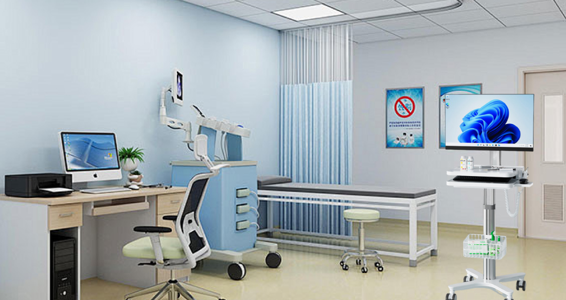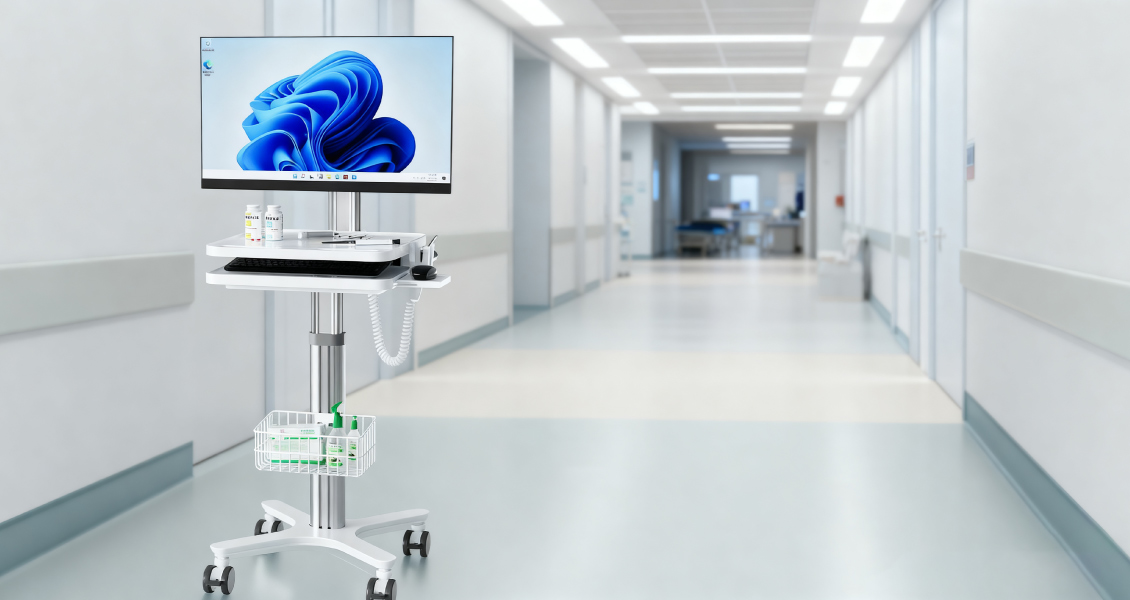 Xe đẩy y tế này có cột điều chỉnh độ cao, hỗ trợ màn hình kỹ thuật số để theo dõi dữ liệu bệnh nhân theo thời gian thực. Thiết kế tinh gọn bao gồm khay bàn phím trượt và đế di động chắc chắn với bánh xe có khóa giúp di chuyển trong phòng khám.