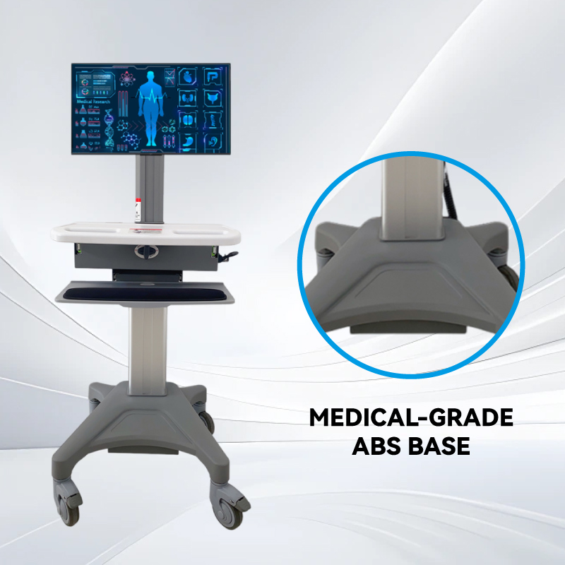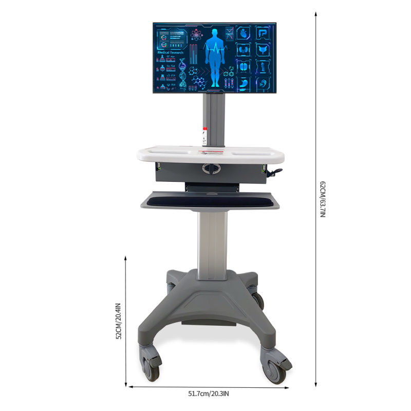 Xe đẩy y tế này có cột điều chỉnh độ cao, hỗ trợ màn hình kỹ thuật số để theo dõi dữ liệu bệnh nhân theo thời gian thực. Thiết kế tinh gọn bao gồm khay bàn phím trượt và đế di động chắc chắn với bánh xe có khóa giúp di chuyển trong phòng khám.