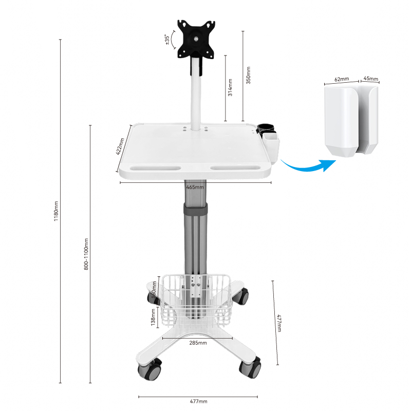 Bàn làm việc rộng rãi với kích thước 465×422mm chịu được tải trọng tối đa 30KG, có thể giữ chắc chắn nhiều thiết bị cùng lúc như màn hình, bàn phím, chuột và máy quét trong miệng. Thiết kế cạnh chống rơi và các lỗ luồn dây cáp được bố trí hợp lý, tạo nên không gian chẩn đoán và điều trị di động gọn gàng và ngăn nắp.