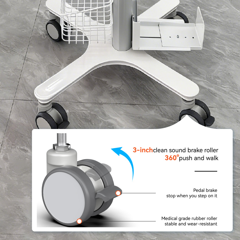 Xe đẩy này được trang bị bốn bánh xe đa năng chất lượng cao 3 inch, hoạt động êm ái, cho phép xoay 360° mượt mà và di chuyển dễ dàng khắp phòng khám. Mỗi bánh xe đều có phanh chân để khóa an toàn trong quá trình điều trị. Thiết kế không gây tiếng ồn giúp tránh làm phiền bệnh nhân, trong khi chất liệu cao su bền chắc giúp ngăn ngừa trầy xước sàn nhà và đảm bảo hiệu suất lâu dài. Ổn định và đáng tin cậy, nó được thiết kế hoàn hảo cho việc sử dụng linh hoạt, tần suất cao trong môi trường phòng khám nha khoa bận rộn.