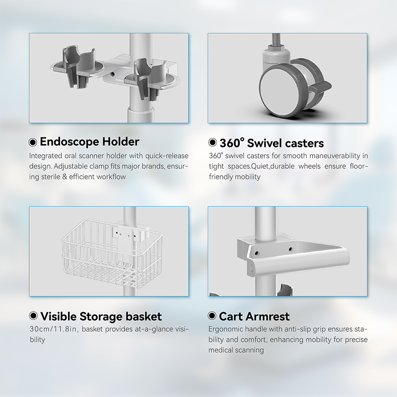 Xe đẩy nội soi này tích hợp một trạm làm việc di động với màn hình lớn, giá đỡ ống nội soi an toàn và giỏ đựng dây. Đế năm bánh xe đảm bảo sự ổn định trong quá trình vận chuyển, đơn giản hóa quy trình nội soi và nâng cao hiệu quả quy trình làm việc trong môi trường lâm sàng.